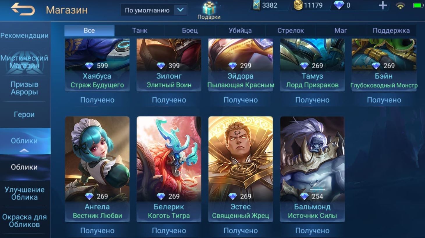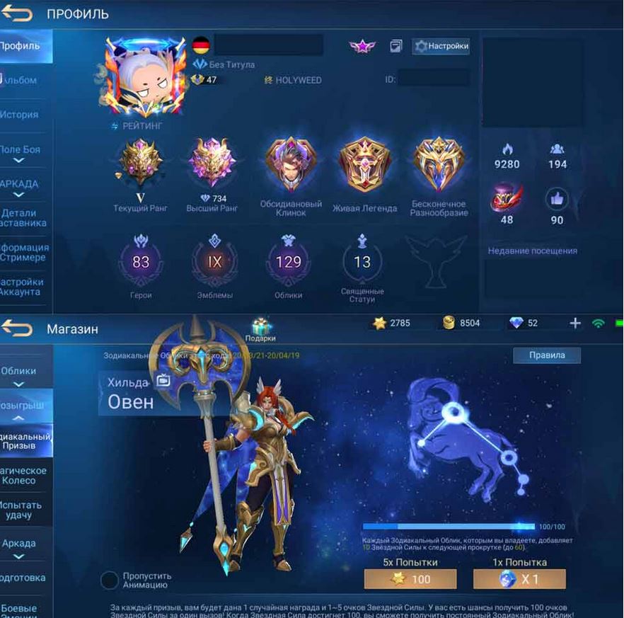 💰Голда: 16231; 💎Алмазы: 25; 💪Количество открытых героев: 83; 🌈Облики: 148;