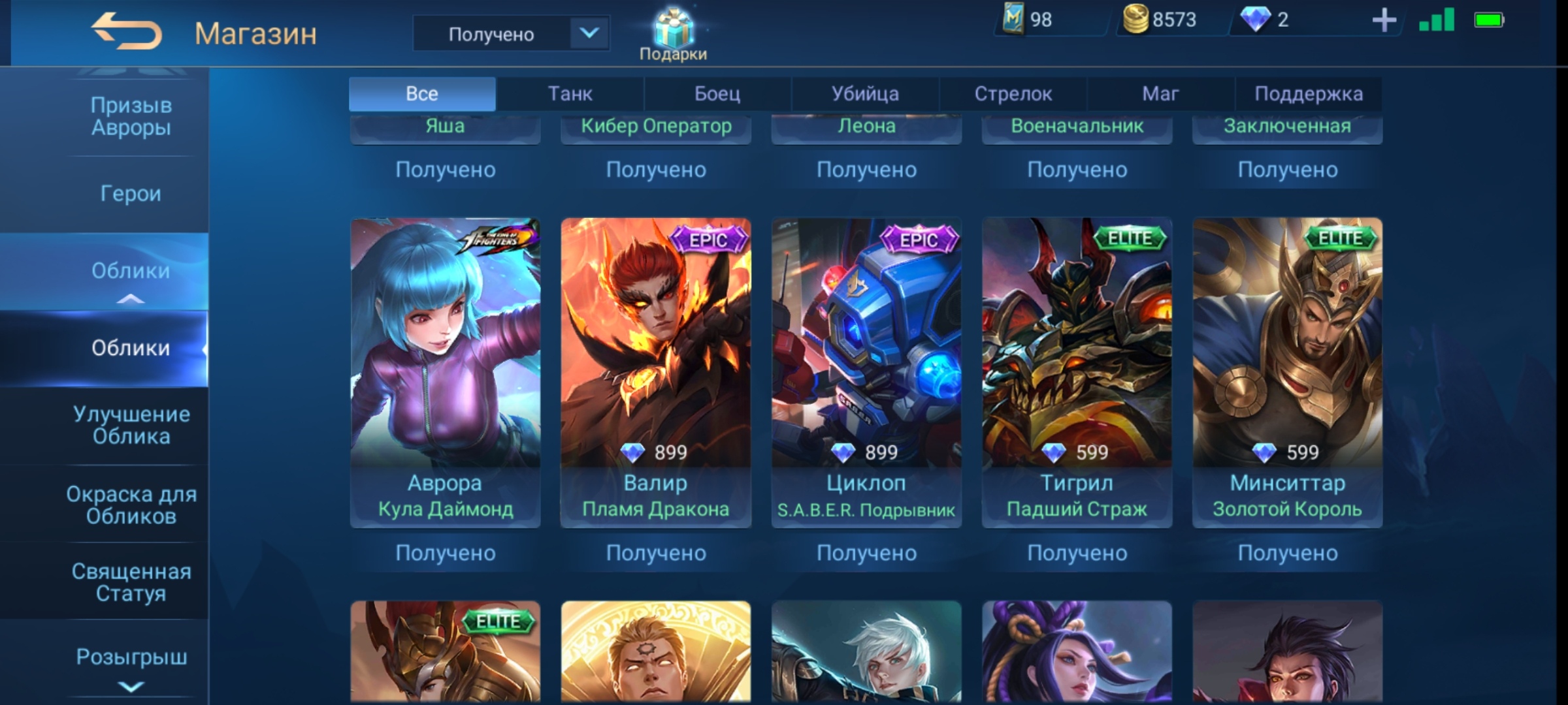 💰Голда: 376133; 💎Алмазы: 5; 💪Количество открытых героев: 96; 🌈Облики: 244;