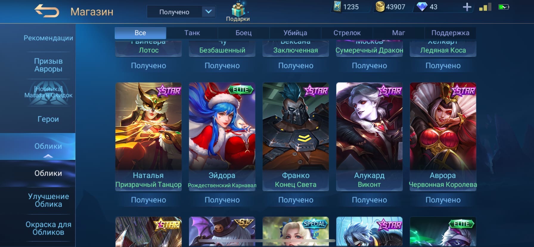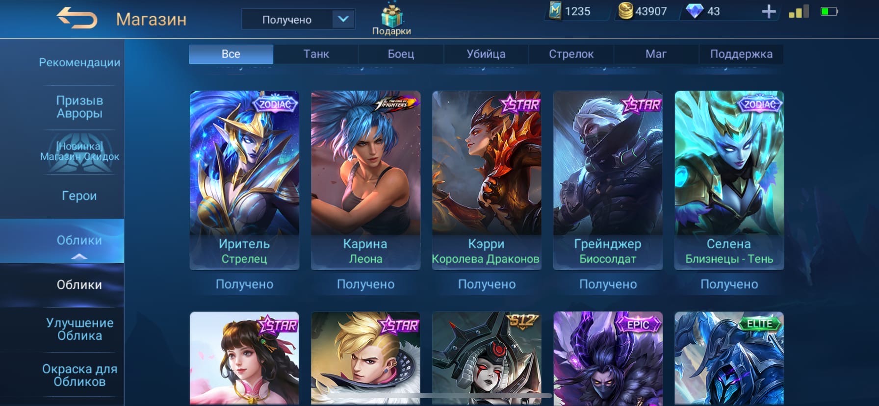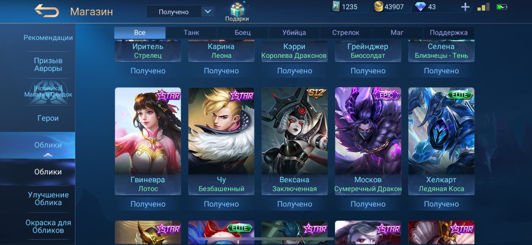 💰Голда: 376133; 💎Алмазы: 5; 💪Количество открытых героев: 96; 🌈Облики: 244;